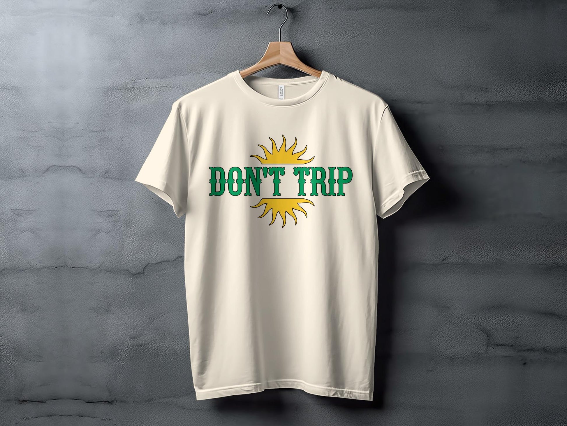 This cool T-Shirt features the phrase "Dont Trip" in a bold, green, eye-catching font, with a radiant yellow sun graphic above and below the text.