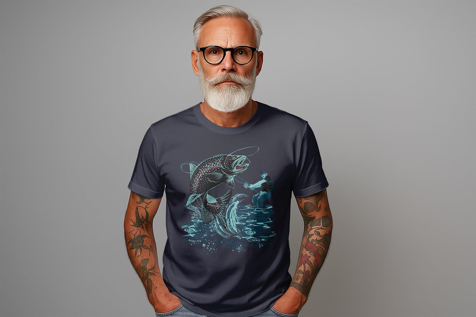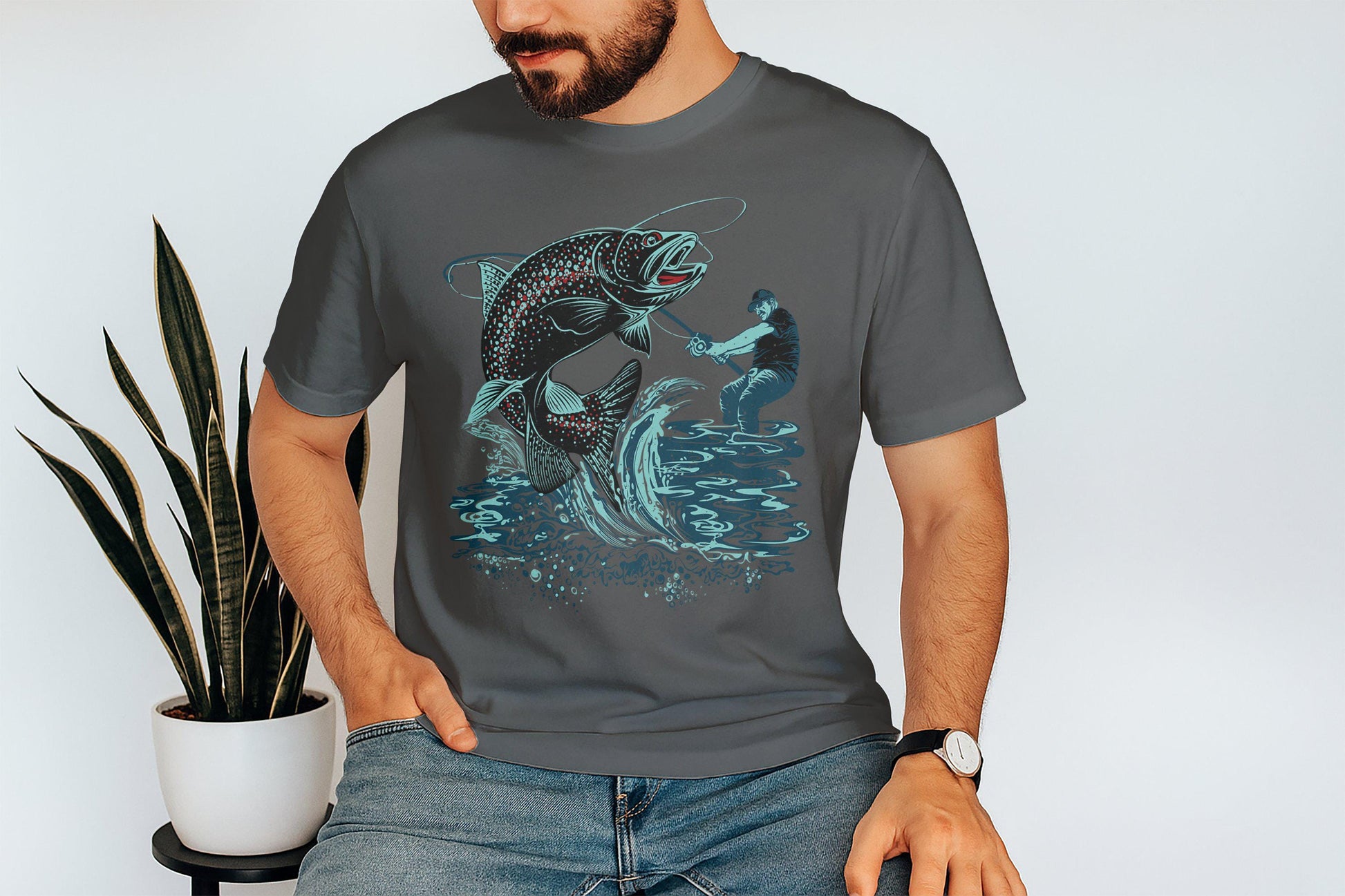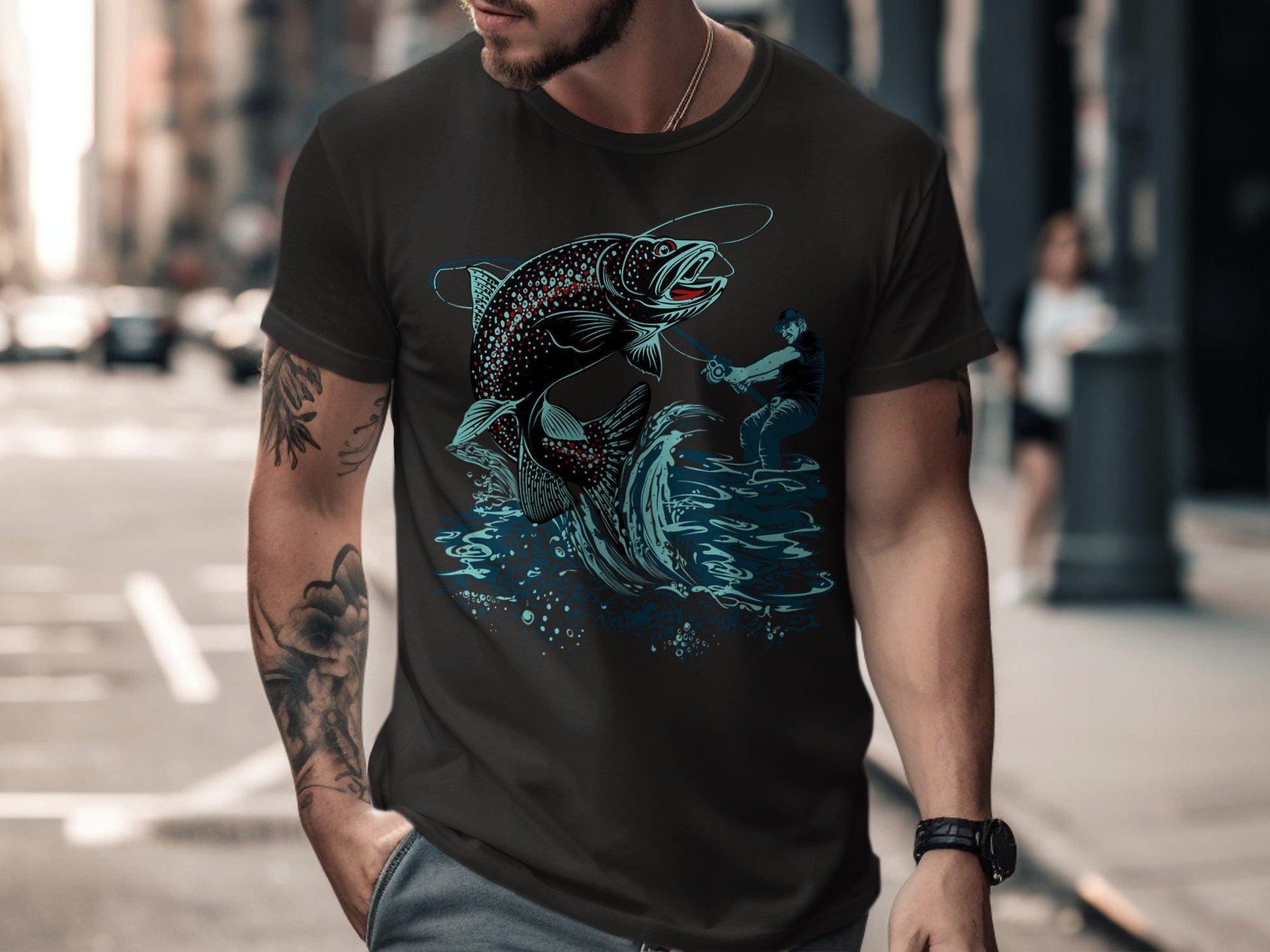 Perfect T-Shirts for the avid fisherman! 🎣 This design features a dynamic scene of a fisherman reeling in a large trout leaping out of the water.🌊 Makes a great Gift for Dad or for Father's Day! Show your love for fishing with this eye catching T-Shirts.