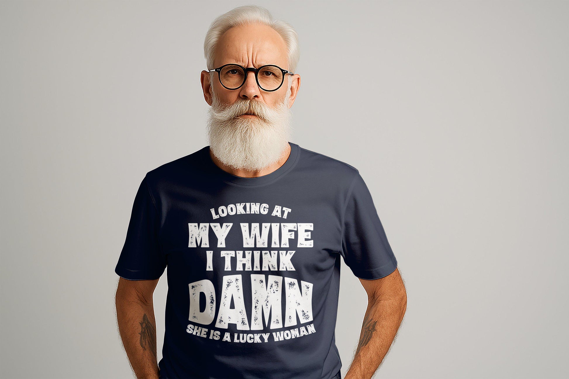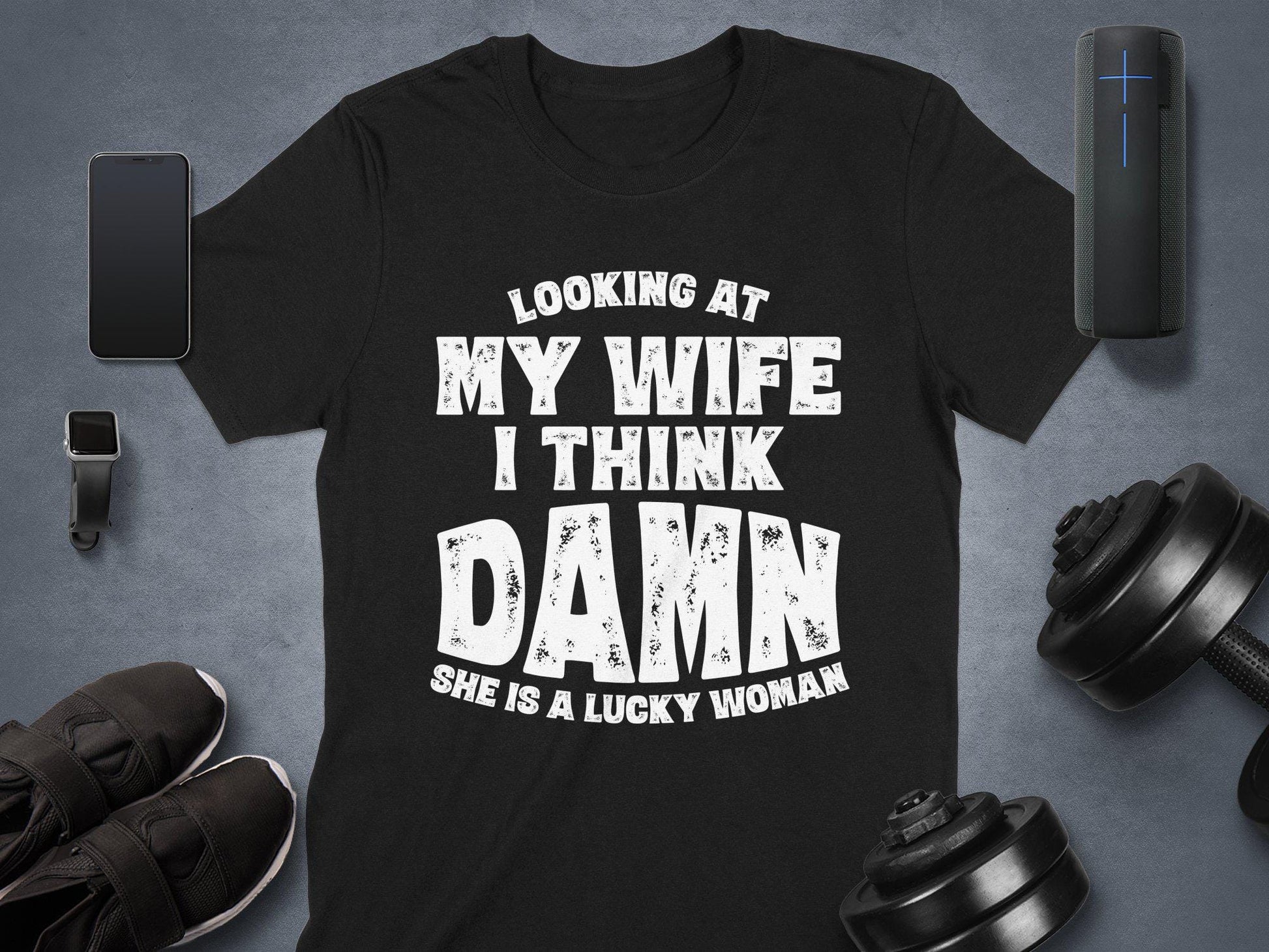 Show your love and admiration for your amazing wife with this humorous T-Shirts 🤩! Perfect as a gift for your husband or a fun novelty item for yourself. This design proudly proclaims "Looking at My Wife I Think Damn She is a Lucky Woman" making it an ideal conversation starter 👔. Get yours now and let everyone know how much you appreciate your wife 💯!