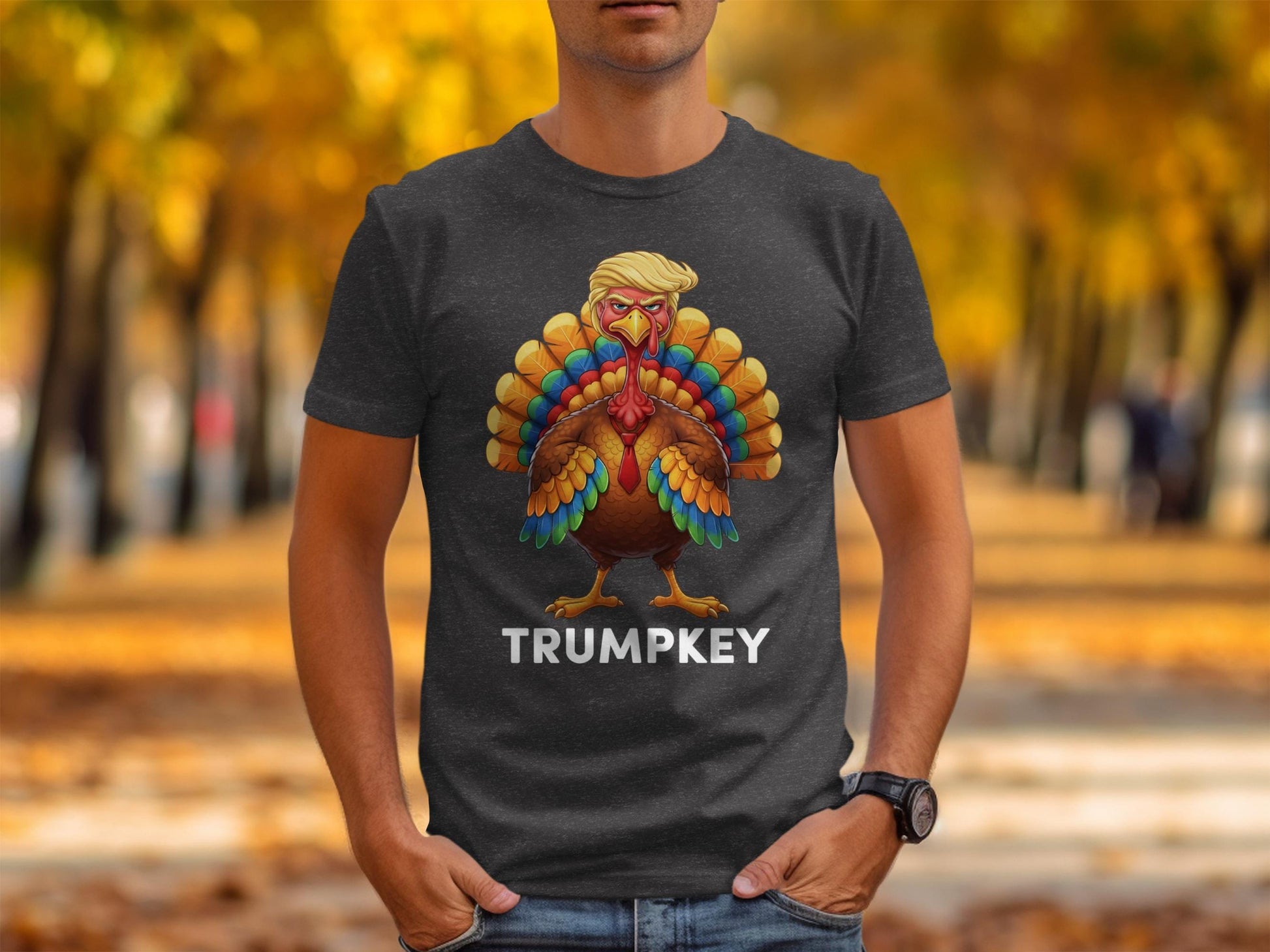 Get ready for Thanksgiving with a side of political humor! 😂 This unique T-shirt features a cartoon turkey with a distinctive hairstyle and a very serious look. Perfect for those who love to make a statement, this tee is sure to be a conversation starter at any holiday gathering.