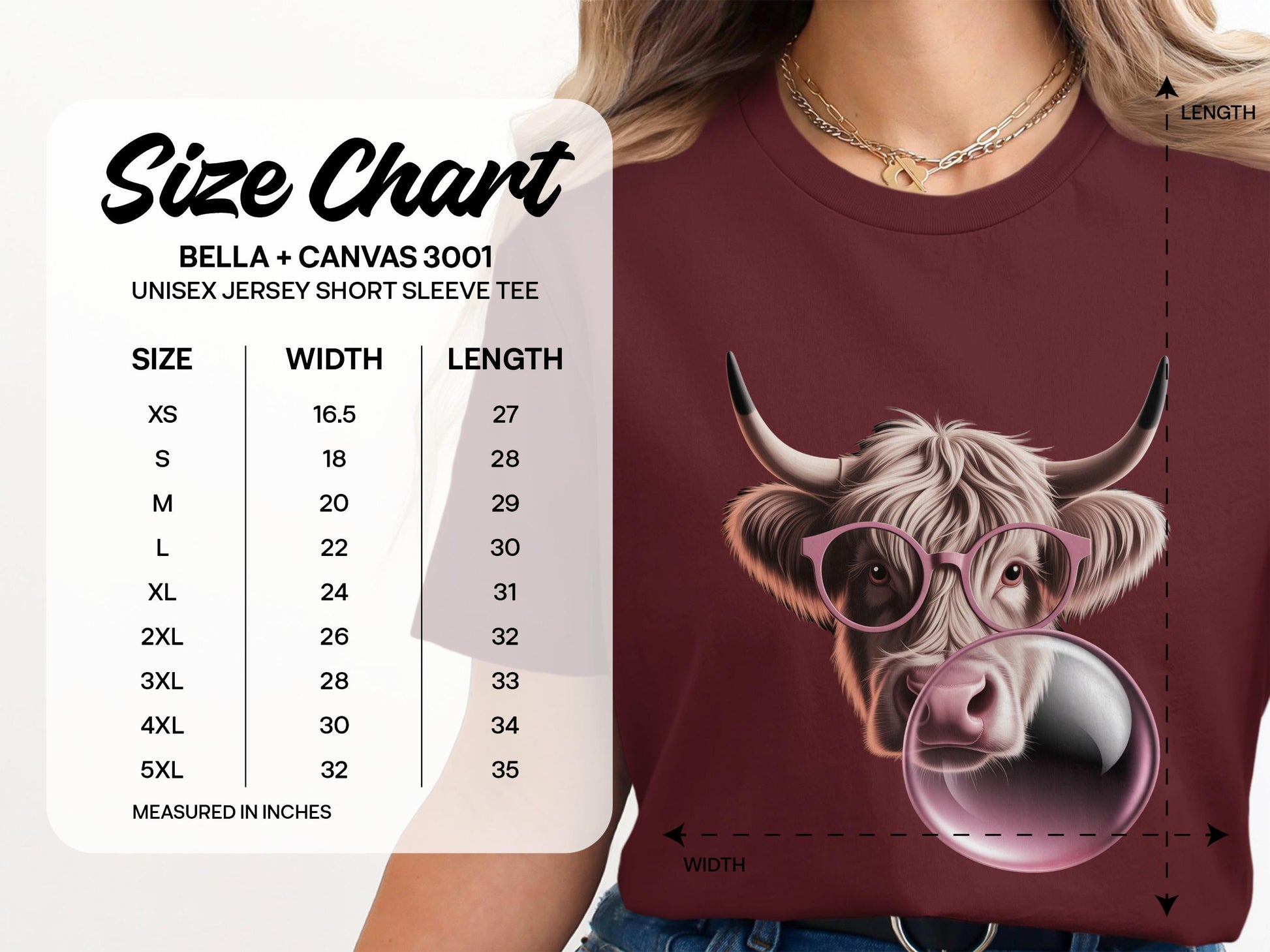 This T-Shirt features a whimsical Highland cow design, perfect for adding a touch of fun to your wardrobe. The cow is sporting pink glasses and blowing a bubble gum bubble. This is a unique design that is sure to turn heads and spark conversations. 🐮