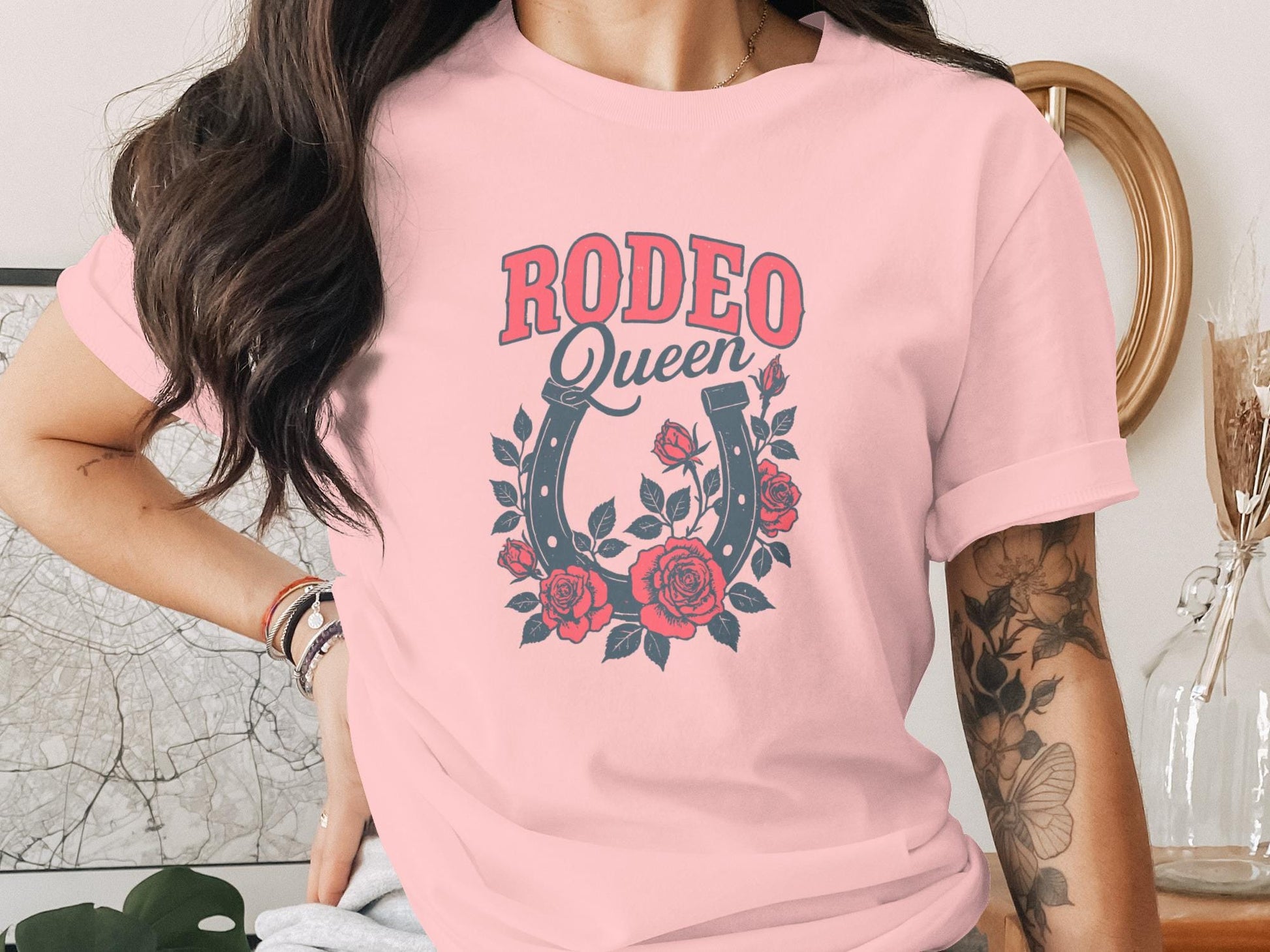 Giddy up and grab this stylish Rodeo Queen T-Shirt! Featuring a horseshoe adorned with beautiful roses, this tee perfectly blends western charm with feminine flair. It's the ideal gift for the country music lover, rodeo enthusiast, or anyone who appreciates a touch of cowgirl chic. Get ready to turn heads and show off your unique style with this must have T-Shirt. 🤠🌹🎸