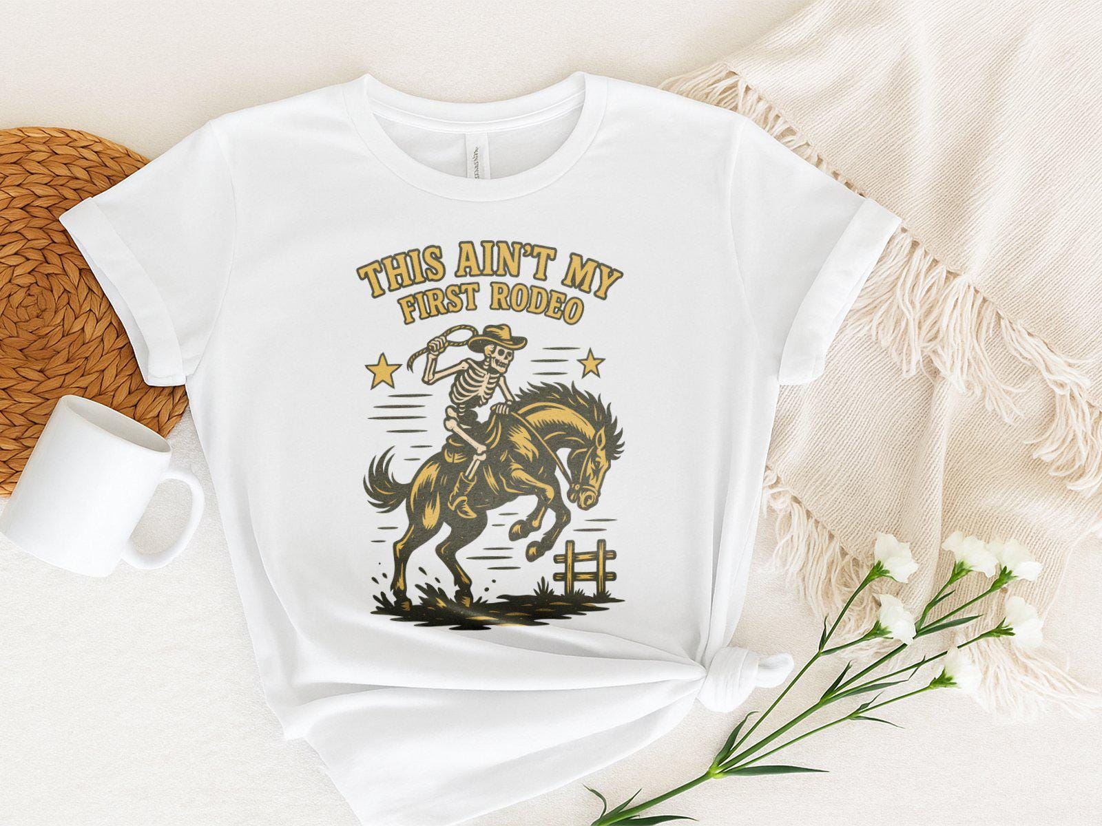 Giddy up, partner! 🤠 This "This Ain't My First Rodeo" T-shirt is perfect for the rodeo enthusiast, cowboy at heart, or anyone who loves a touch of Western flair. Featuring a skeleton cowboy riding a bucking bronco, this tee is sure to turn heads and spark conversations. Ride on! 🐴